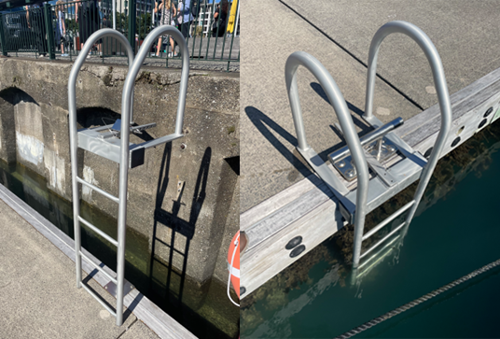 Larger mobile safety ladders (pictured below) will be installed at the start of each pier to support emergency response in the event of someone falling into the water. These ladders are more stable and extend deeper than the existing (smaller) mobile safety ladders located at the safety stations on each pier. The new ladders provide improved access and safety during use.